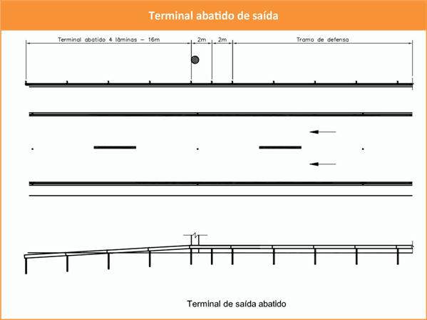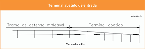 Terminal abatido: Composto por quatro módulos de defensa, variando a altura desde a posição de projeto até sua extremidade totalmente enterrada (Devendo observar um ângulo menor ou igual a 4° 30’, entre o eixo superior das lâminas e o plano da pista, o que corresponde a uma relação aproximada de 1:12), que será firmemente fixada ao solo por meio de terminal apropriado.