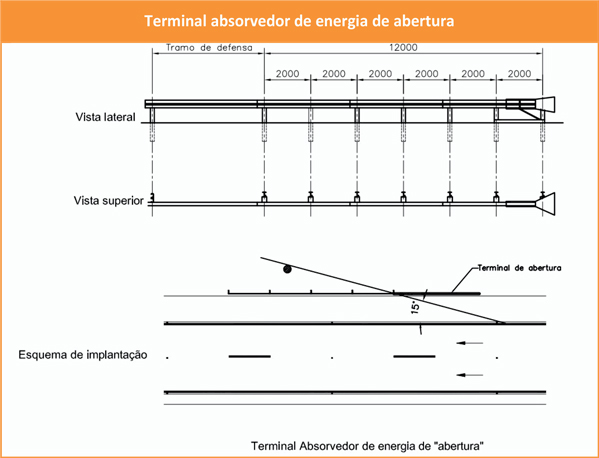 Terminal absorvedor de energia: Tipo de terminal que ao ser impactado frontalmente absorve a energia cinética do veículo errante, conduzindo-o a uma parada segura. Para os terminais de abertura, quando o impacto ocorre na sua lateral, após o inicio do comprimento necessário, o terminal, por meio de sua ancoragem, permite desenvolver tensão e redirecionar o veículo. Para os terminais de não abertura, o redirecionamento ocorre desde o inicio do sistema, isto é, desde o cabeçal de impacto.