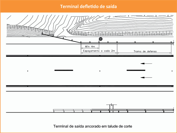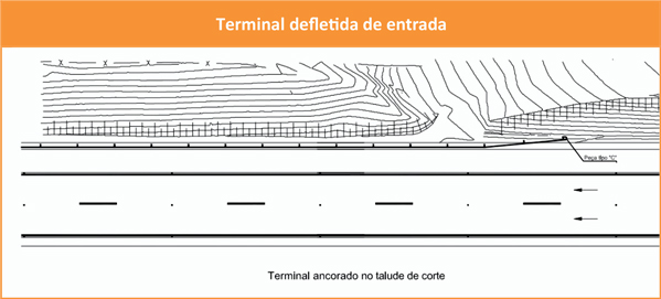 Terminais de defensa defletida (ancorado em talude de corte): conjunto onde as defensas são defletidas horizontalmente prosseguindo até o talude de corte onde é firmemente ancorado.