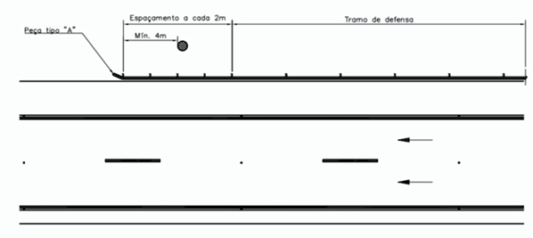 As defensas devem ser interrompidas sob linhas de transmissão, como se fossem uma passagem para pedestres, com uma abertura mínima de 10,00 m para cada lado da linha, conforme figura abaixo.