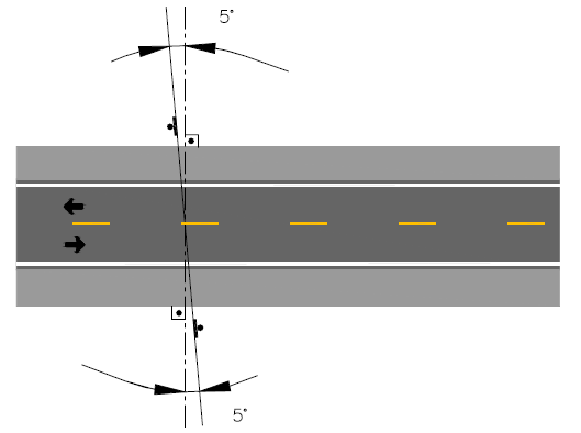 Quando não for possível manter o paralelismo entre as lâminas das defensas e a diretriz, ou quando a defensa, por qualquer razão, deve desviar-se lateralmente, os trechos não paralelos devem ser mantidos dentro de um ângulo máximo de 2° 20’, contados a partir do eixo da via, o que corresponde a uma relação aproximada de 1:25.