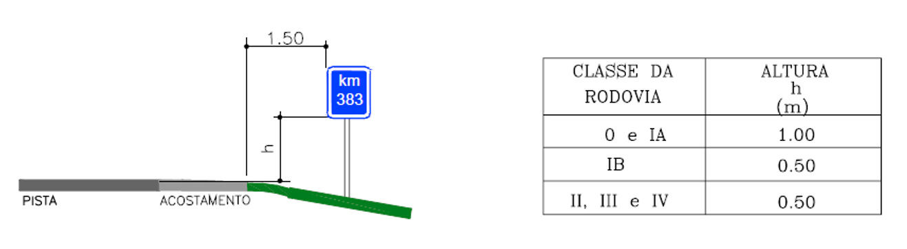 A distância mínima adotada entre a linha de bordo e o dispositivo de contenção será de no mínimo 0,30 m em vias consideradas urbanas e 0,50 m (Figura abaixo) em vias consideradas rurais, porém sempre que possível utilizaremos o dispositivo com no mínimo 1,00 m da linha de bordo, a fim de reduzir o efeito visual da restrição lateral.